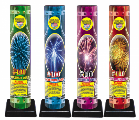 Size 100 single-shot Artillery in a variety of effects. Four unique effects, one for each artillery shell. Effects include: Red Dahlia, Brocade Silver to Yellow, Colorful Peony with Crackling and Green Chrysanthemum. Each shot will go approximately 150 feet in the air and has excellent break and color.