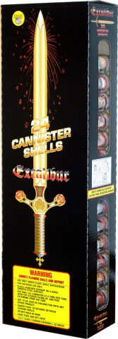 Excalibur Fireworks 24 pack. The #1 selling artillery shell of all time and considered the best firework artillery shell on the market! The Excalibur Artillery have been wowing fireworks enthusiasts of all ages for the last decade and will continue to wow them for years to come.The Excalibur firework comes with 24 of the best quality canister shells on the market and bundled with high-density polyethylene (HDPE) tubes.The ShellsThe shells included in the Excalibur Artillery Shell are the best available to the public, hands down. These high quality canisters break over 250 feet high, and over 200 feet wide. They are unsurpassed by any other consumer shell.The Excalibur contains 24 unique shells with the following effects:Jumbo Red DahliaGreen Glittering with CracklesRed and Silver PeonyJumbo CracklingSilver Crackling PalmJumbo Silver ChrysanthemumSilver Palm with CracklingJumbo Brocade CrownGolden Willow with CracklingJumbo Green ChrysanthemumBrocade Silver to Green WhirlwindJumbo CracklingDragon EggsPurple and Green PeonyBrocade Silver to Blue WhirlwindMulti-color Peony Blue WhirlwindMulti-Color PeonySilver Wave to Red Whirlwind An Important Notice to Our Valued CustomersThe Excalibur firework is hands-down the highest quality, most successful consumer artillery shell on the market today. As a result it is repetitively copied and imitated by our competitors who churn out inferior and potentially unsafe products in similar looking or themed packaging in an effort to dupe would-be consumers. They will also use similar sounding names for their products. When searching for Excalibur, always make sure that box has the trademarked World Class Fireworks Logo in the top left corner on the front and the back of the box. This will ensure that you are getting a genuine World Class Excalibur firework.